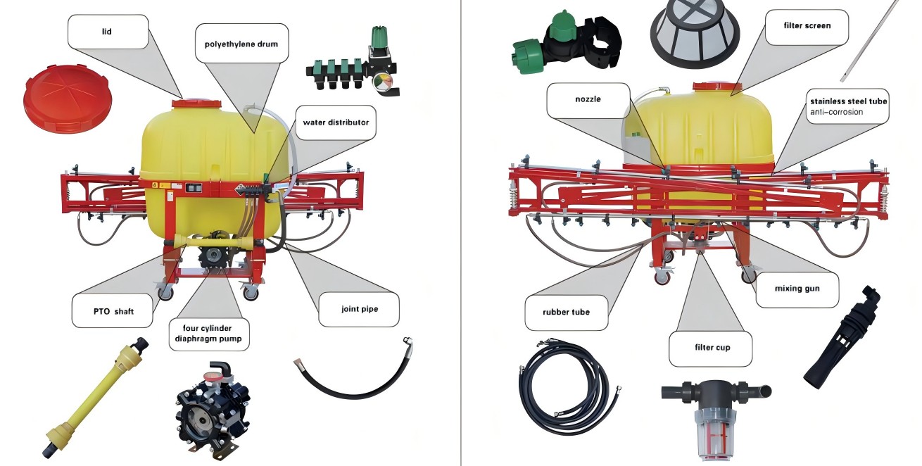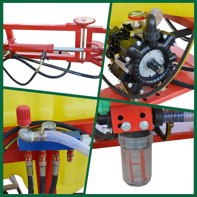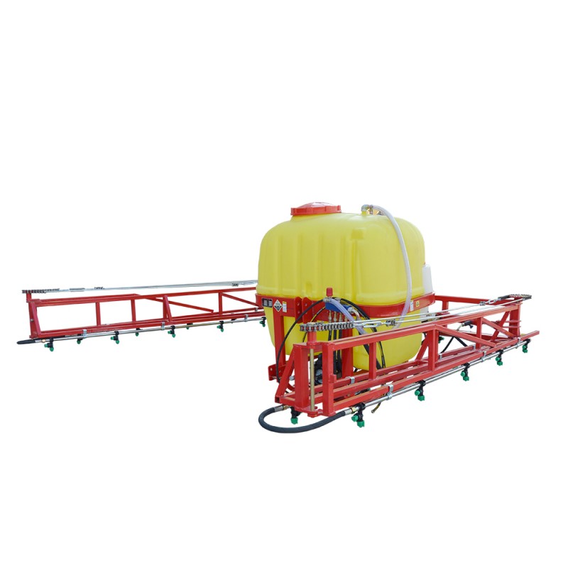 Penyembur medan hidraulik terutamanya terdiri daripada tangki ubat cecair, sistem hidraulik, mekanisme boom, muncung dan sistem kawalan. Prinsip terasnya adalah menggunakan traktor atau jentera kuasa lain untuk menggantung dan membawa, dan menggunakan sistem hidraulik untuk memacu pengangkatan dan lipatan boom, dengan lebar operasi 8-12 meter. Mesin ini menggunakan pam diafragma 4 silinder untuk menstabilkan anjakan, dan bekerjasama dengan sistem penapisan empat peringkat untuk mengelakkan penyumbatan, supaya ubat cecair ditekan dan disembur melalui pengabosan muncung untuk mencapai operasi penyemburan kawasan besar.
