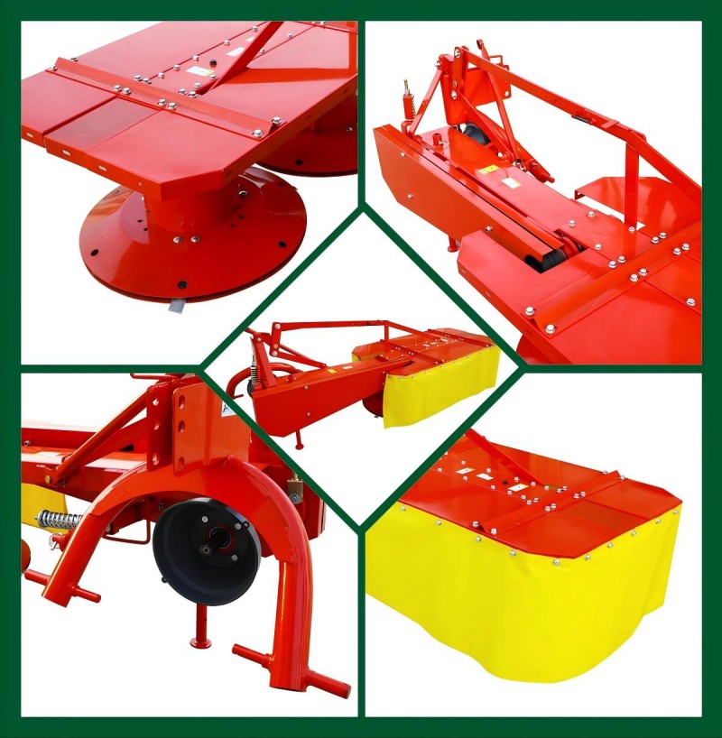 Pemotong drum yang dipasang juga boleh dipanggil pemotong cakera berganda. Setiap dram mempunyai tiga pisau memotong, yang boleh digantikan dengan cepat dengan alat mudah. Rumput yang dipotong oleh pisau diletakkan di antara dua gendang, tempat yang longgar. Tiga belts menghantar kuasa ke aci gear input, dan kemudian ke aci pemacu utama, yang seterusnya memacu drum melalui gear serong. Terdapat peranti pemisahan pada pemotong drum, yang secara automatik beroperasi apabila pemotong mencecah halangan. Ini melindungi dram daripada kerosakan.